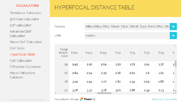 An excellent app with a HFD calculator is available from https://photopills.com Photopills has a free online calculator and an inexpensive app for phones. They also have a number of other calculators such as DoF & diffraction. Photopills is also an excellent source for a more detailed understanding of camera focus.
