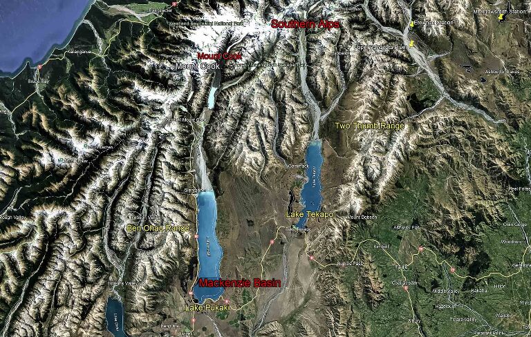 From Maniototo we went north via Danseys Pass, a steep, winding dirt road periodically closed in the winter, to reach Mackenzie Basin. The basin is a vast, dry tussock land with the Southern Alps on its west, big braided rivers and turquoise-colored lakes like Ohau, Tekapo and Pukaki.
